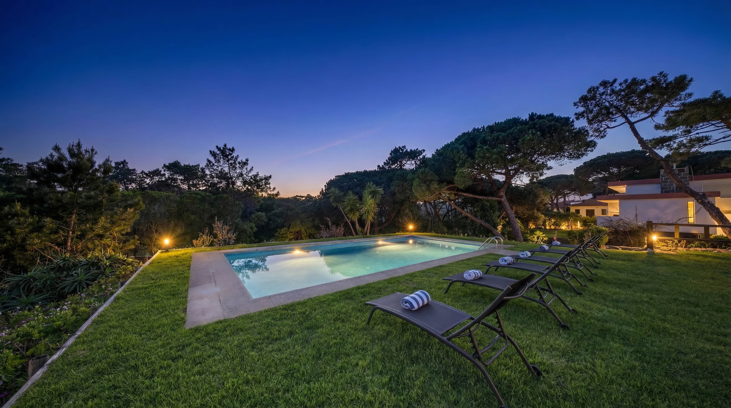 Rodeado de un gran jardín, ofrece un amplio espacio para que los niños jueguen mientras los adultos se relajan junto a la piscina. Las atracciones cercanas incluyen los antiguos castillos de Sintra, las hermosas playas de Cascais y el cabo Roca, el punto más occidental de la Europa continental.