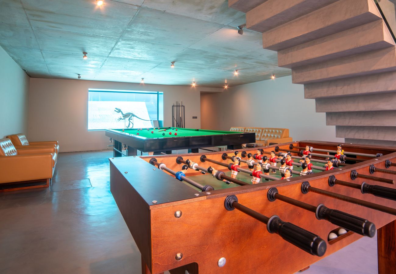 L'intérieur avec cuisine, salon et salle à manger dans un concept ouvert, ne présente pas seulement une surface spacieuse de 100 m², mais aussi un espace pour regarder l'extérieur et son magnifique environnement, rendu possible par ses grandes fenêtres. Une salle de jeux avec une table de snooker, un baby-foot et un coin salon complètent à merveille cette maison de vacances.