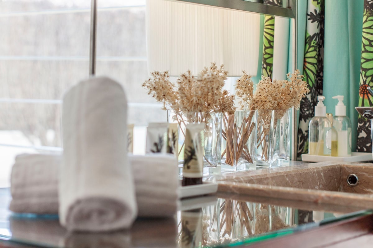 La décoration est minimaliste et confortable. Les grandes fenêtres offrent une excellente luminosité