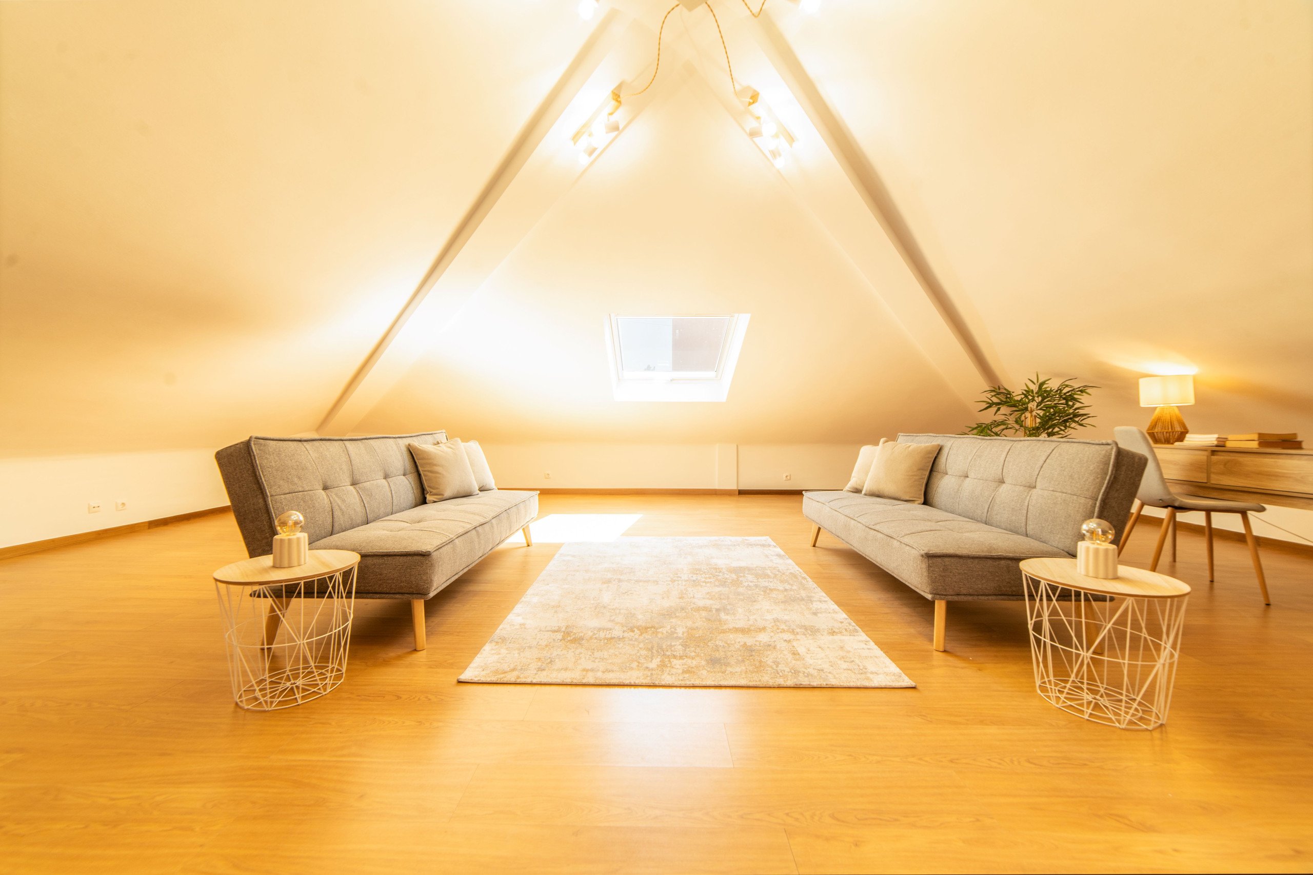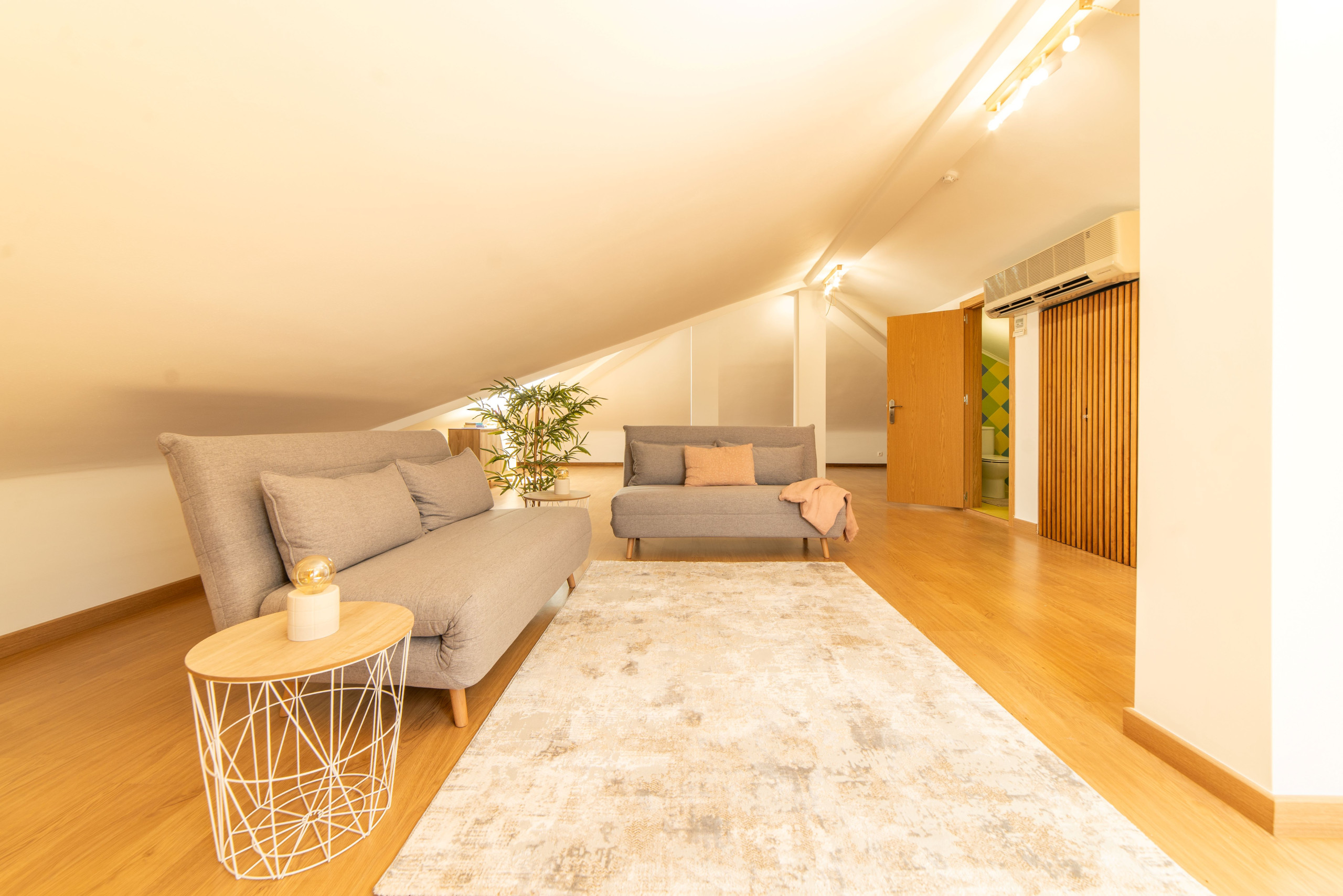 Salon avec 2 canapés-lits 1.40 m x 2.00 m (pouvant être préparés en lits sur demande), smart TV, AC, WC