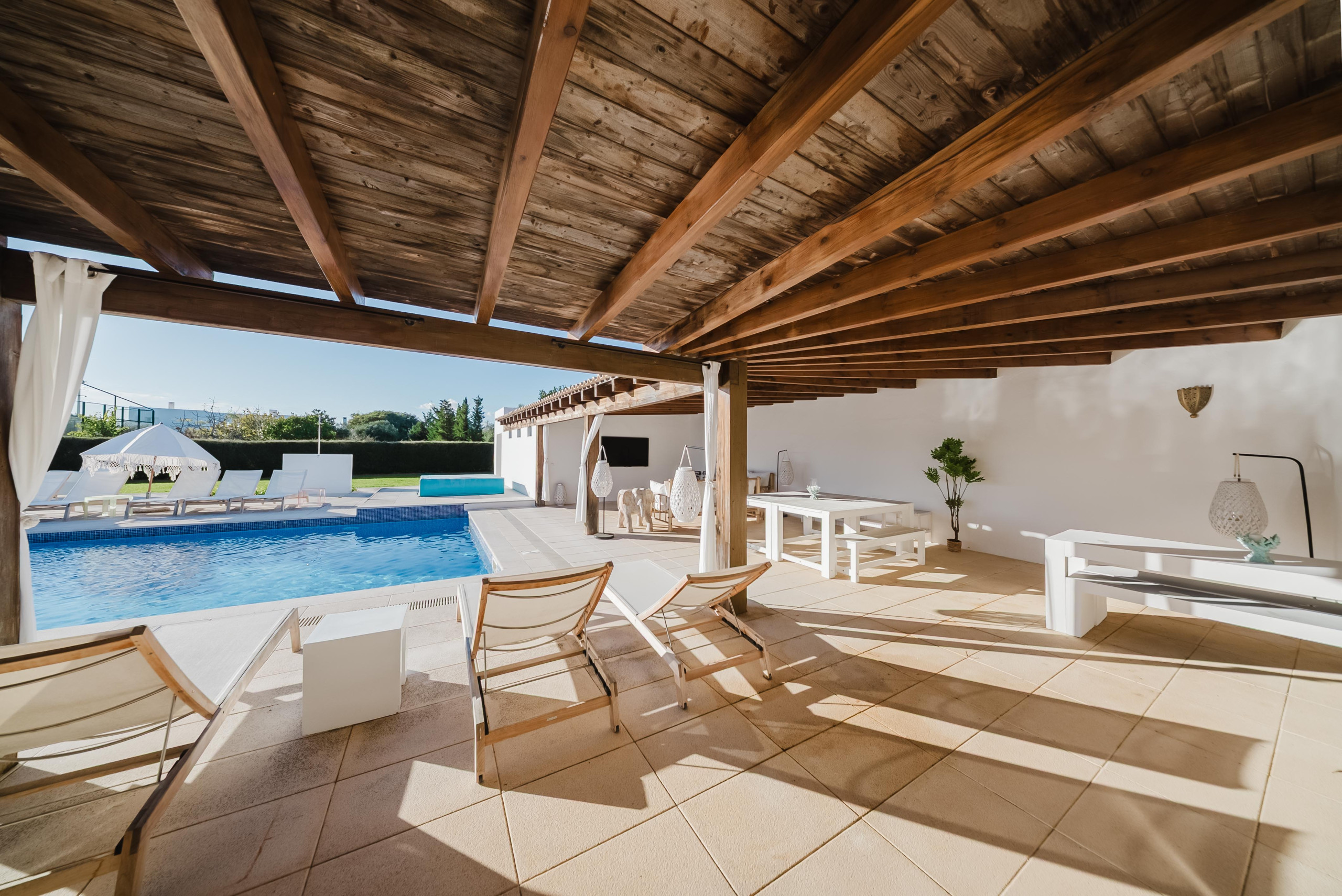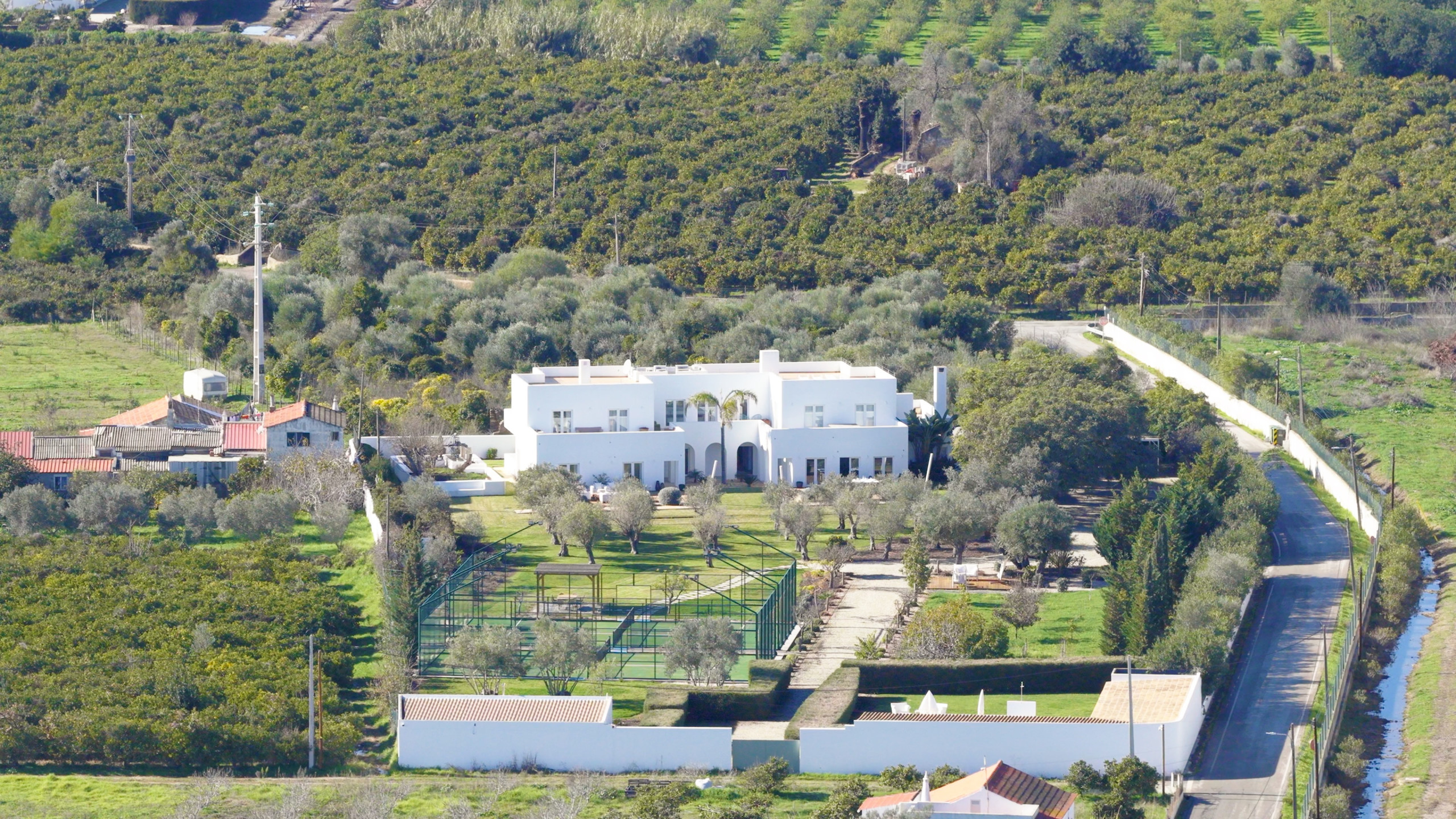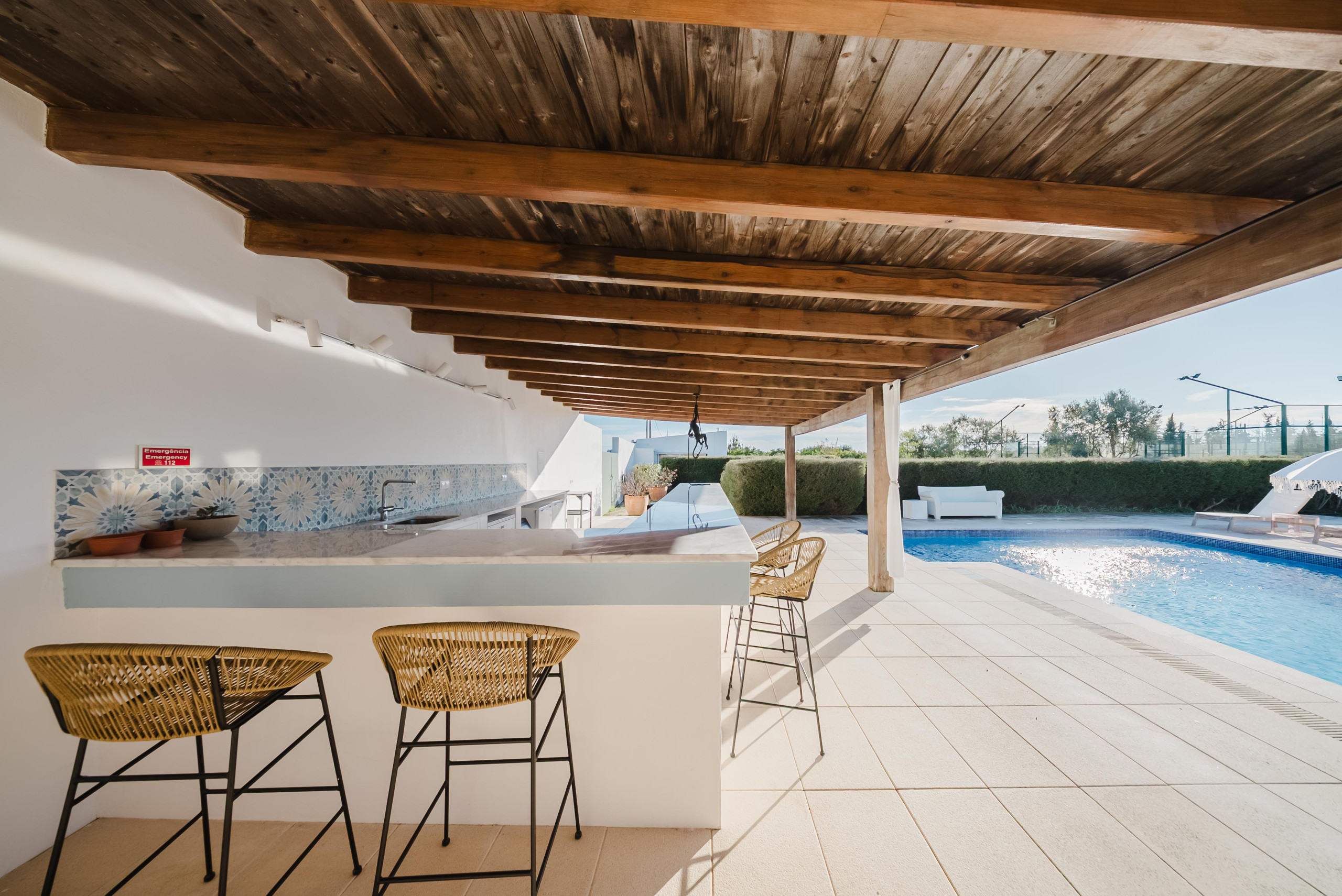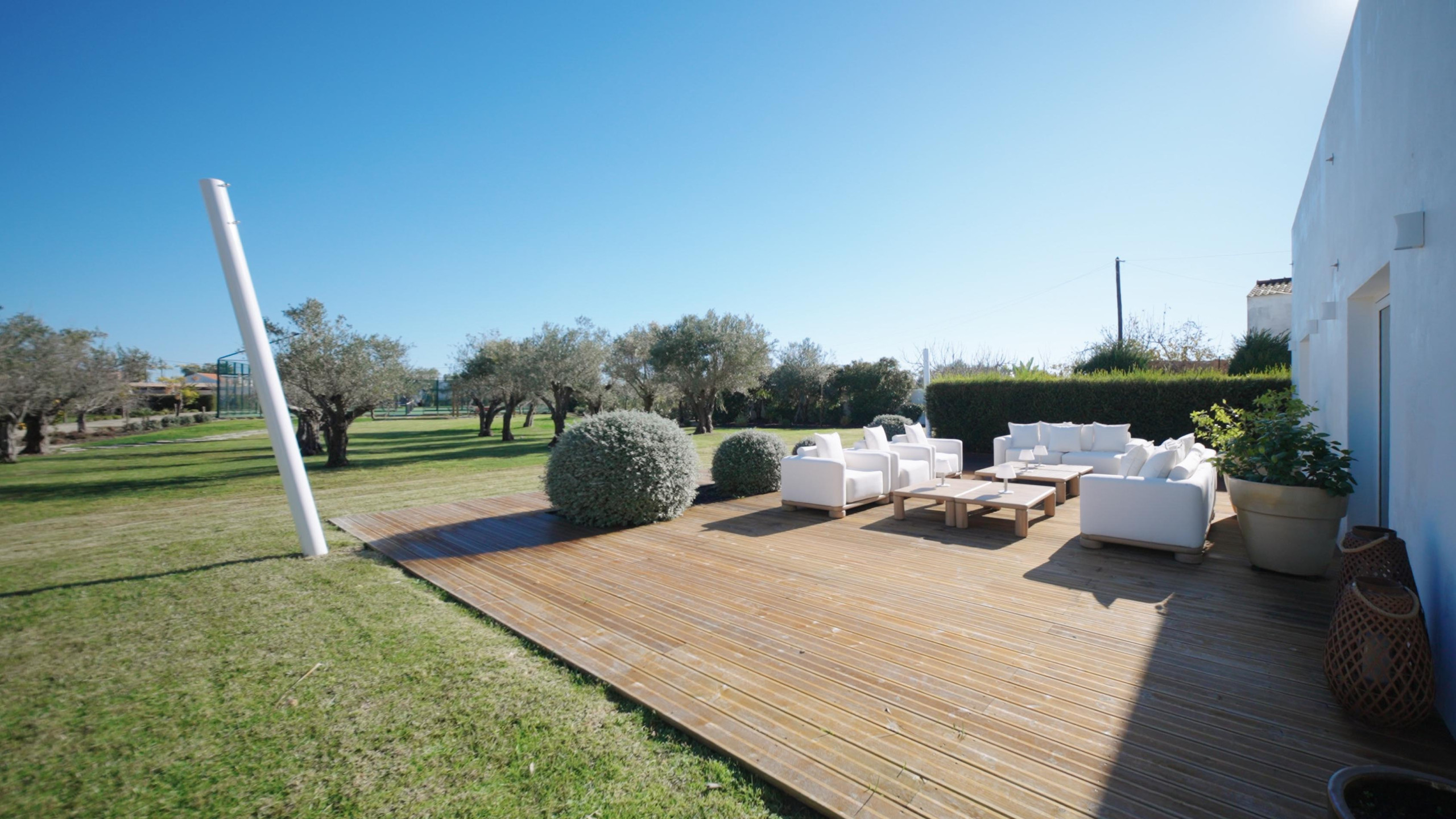 À l’extérieur, les hôtes peuvent profiter d’une grande piscine avec un espace détente, comprenant un pool house, une télévision et une cuisine extérieure avec four à pizza et barbecue. Les équipements supplémentaires incluent une salle de sport climatisée et deux courts de padel panoramiques en verre. Plusieurs terrasses, au rez-de-chaussée, au premier étage et sur le toit, offrent différents espaces ensoleillés ou ombragés pour les repas, la détente et les réceptions.