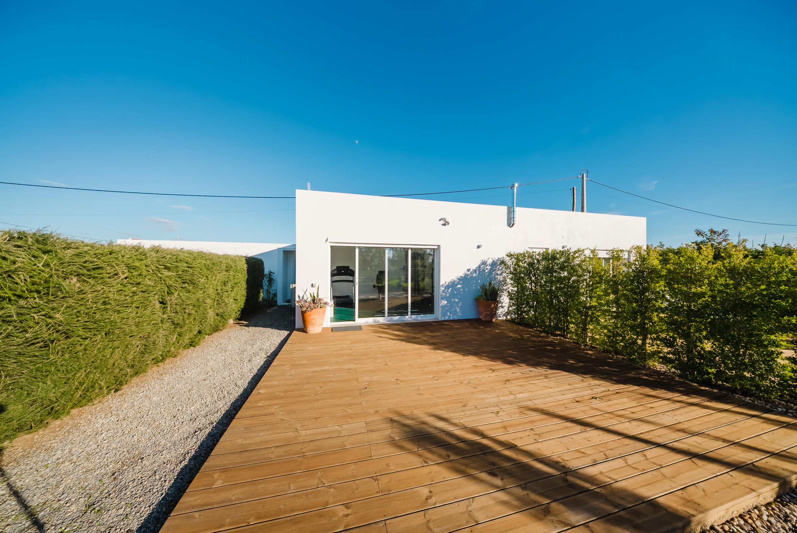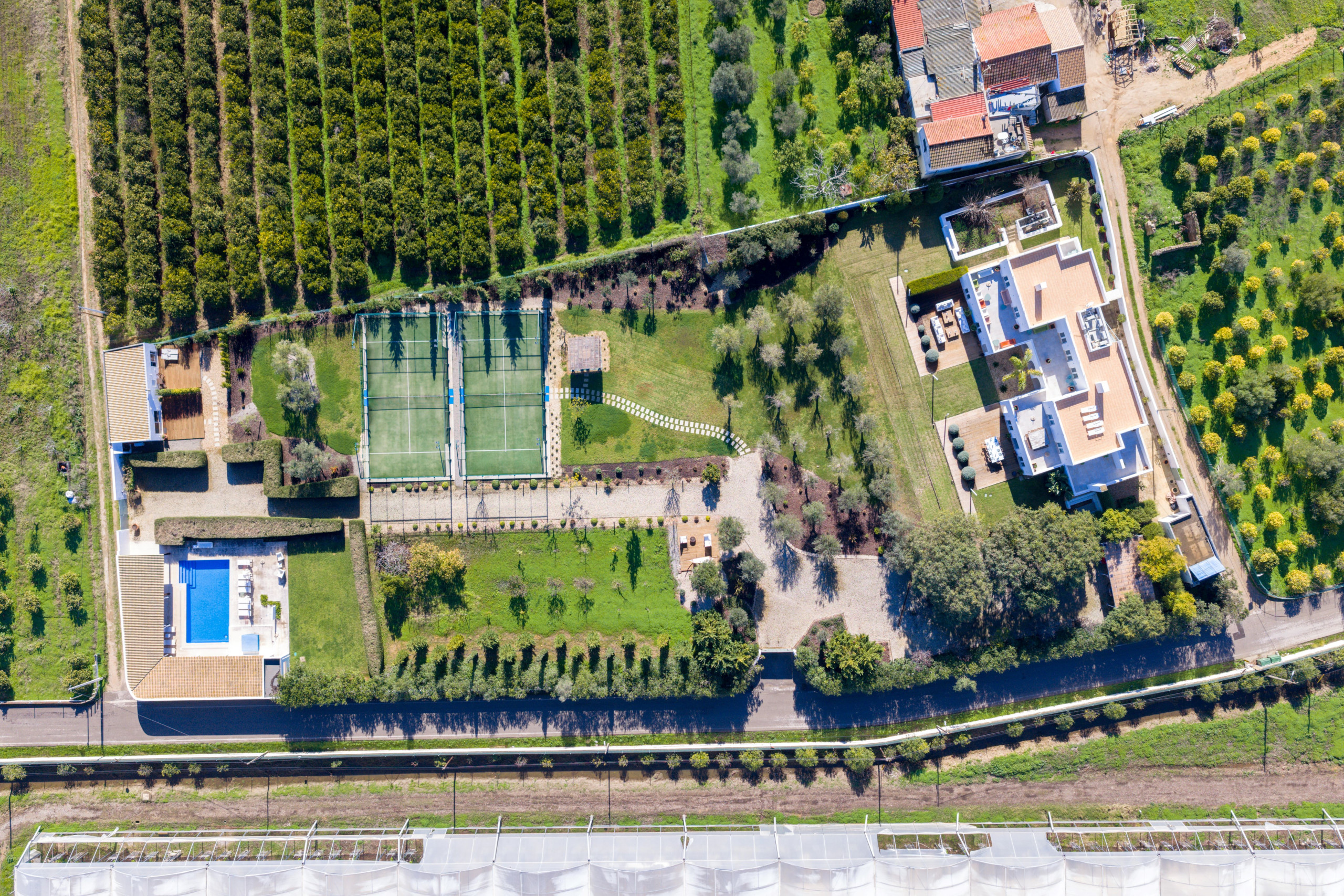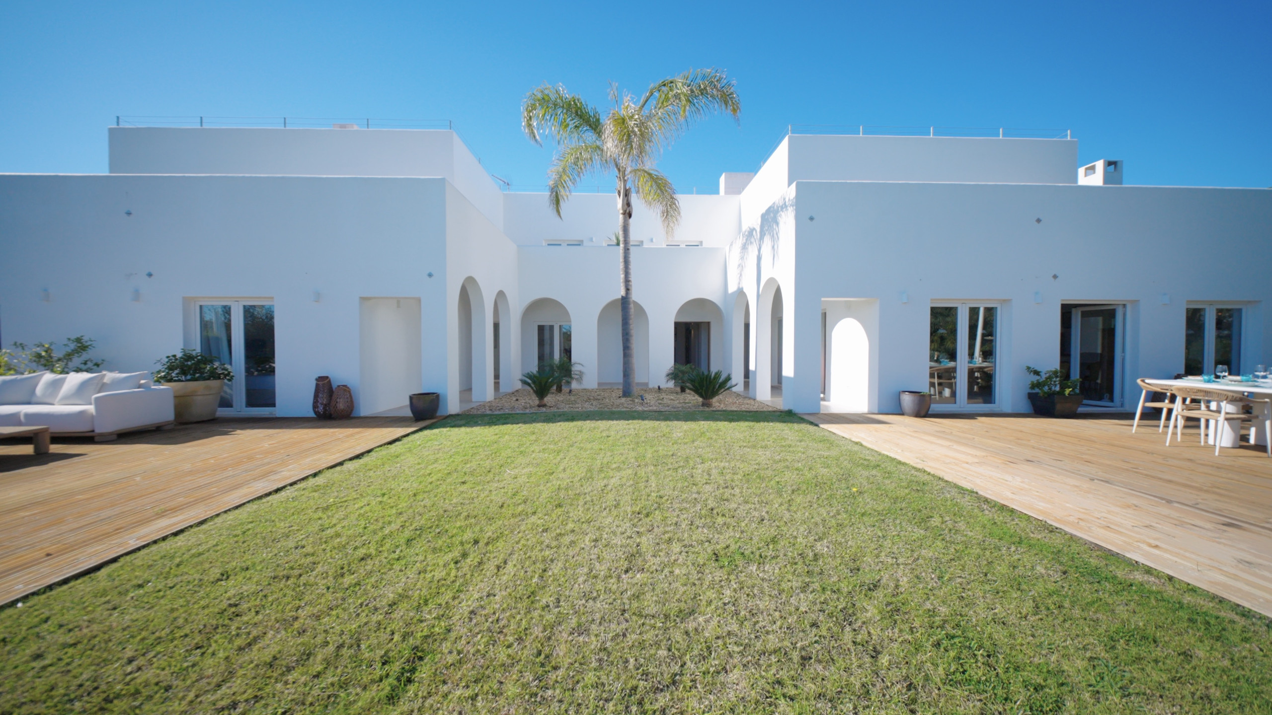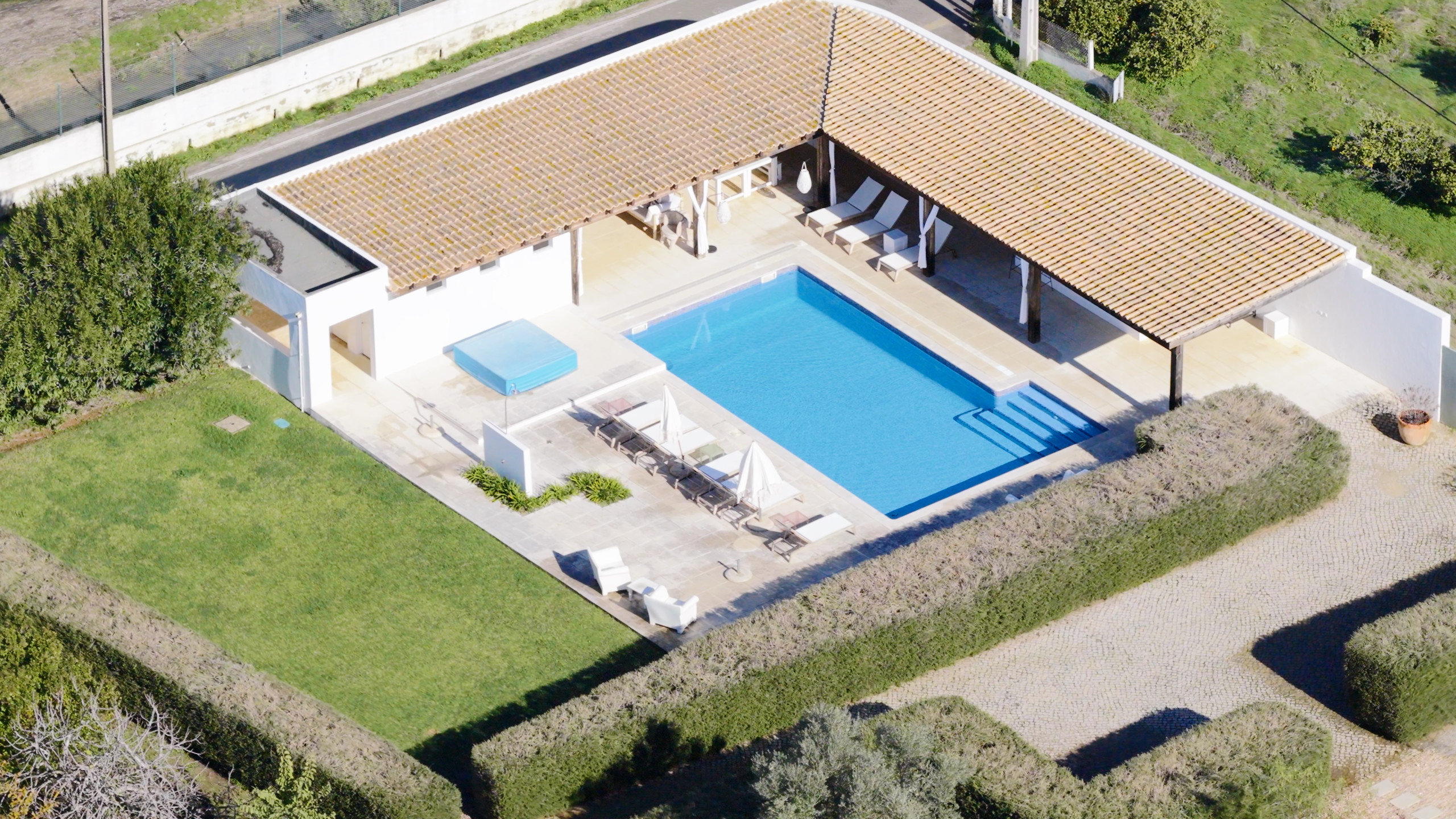 À l’extérieur, les hôtes peuvent profiter d’une grande piscine avec un espace détente, comprenant un pool house, une télévision et une cuisine extérieure avec four à pizza et barbecue. Les équipements supplémentaires incluent une salle de sport climatisée et deux courts de padel panoramiques en verre. Plusieurs terrasses, au rez-de-chaussée, au premier étage et sur le toit, offrent différents espaces ensoleillés ou ombragés pour les repas, la détente et les réceptions.