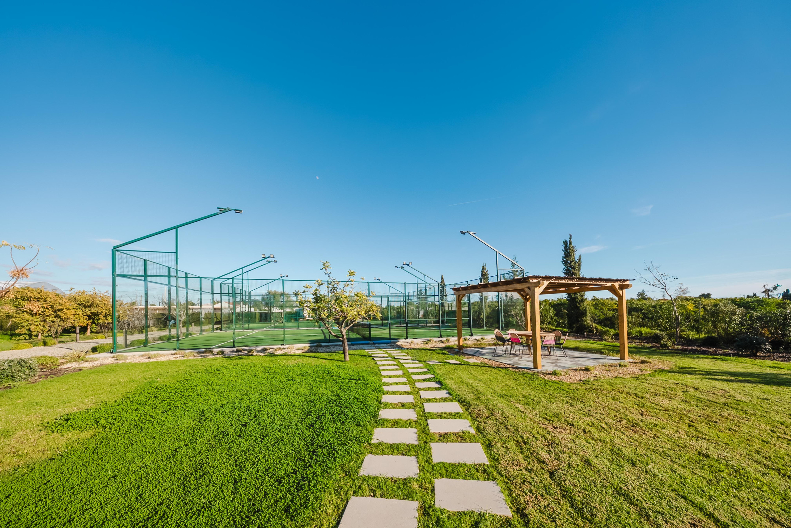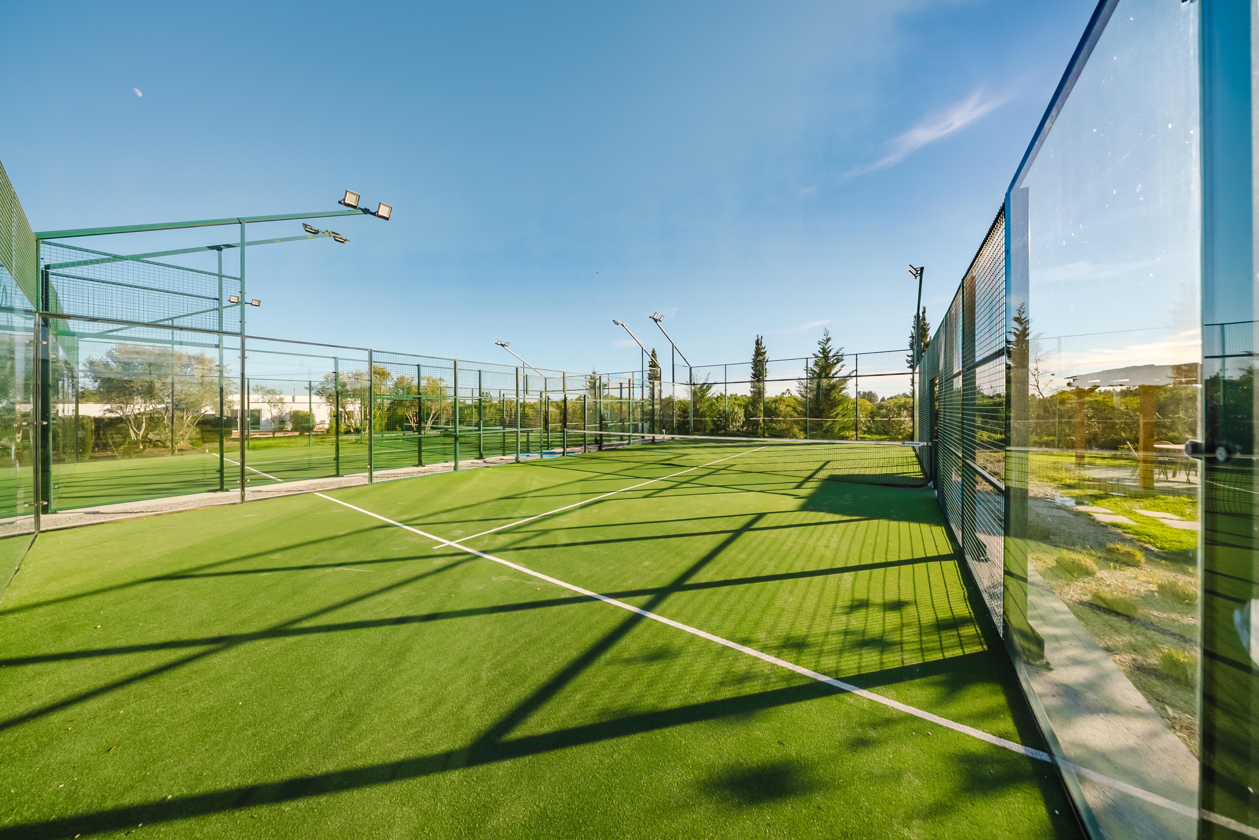 2 courts de padel panoramiques en verre avec pagode d'observation
