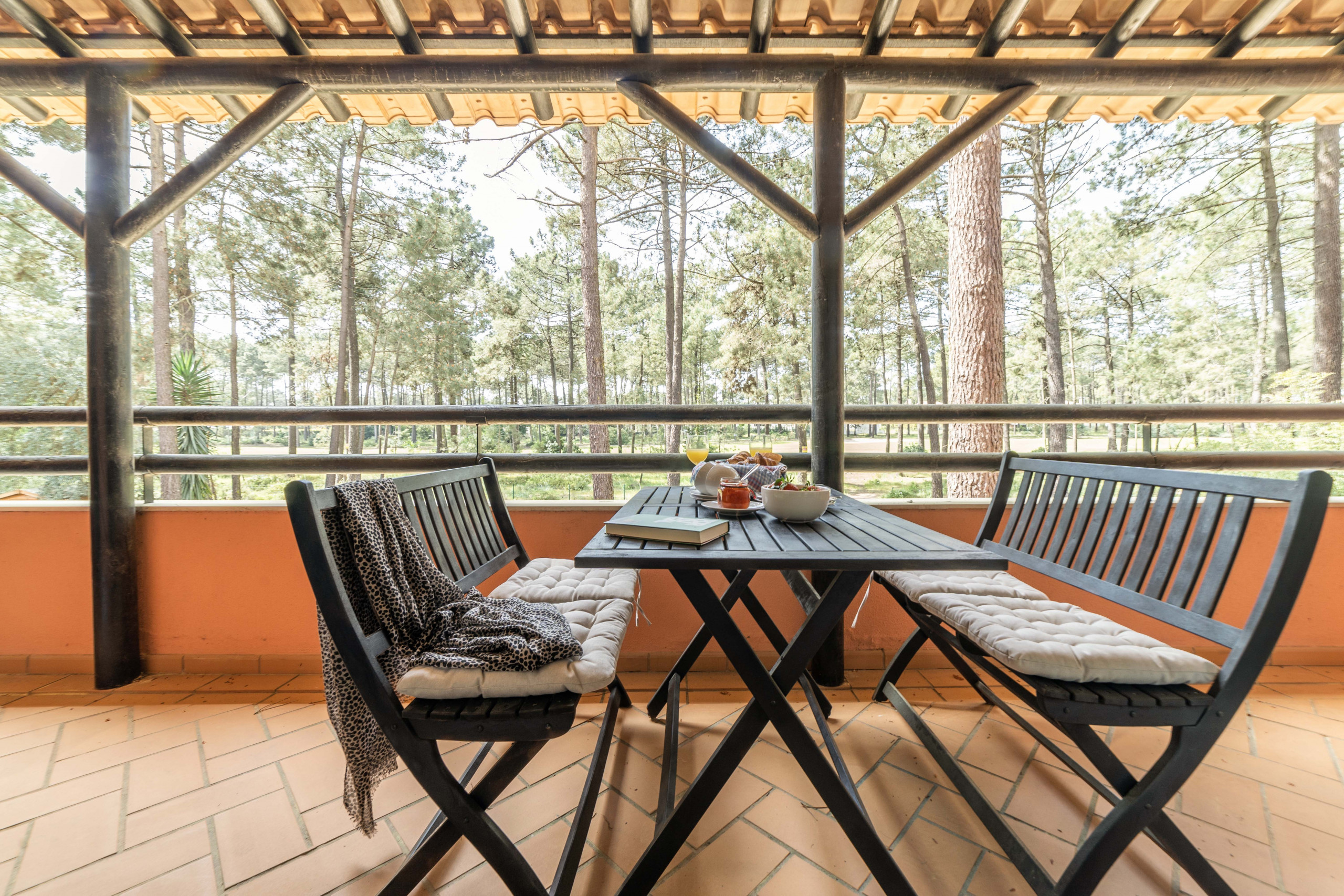 Com vista para o Campo de Golfe da Aroeira", este apartamento está situado numa herdade vedada, com milhares de pinheiros e vários lagos, encostada a uma área protegida.