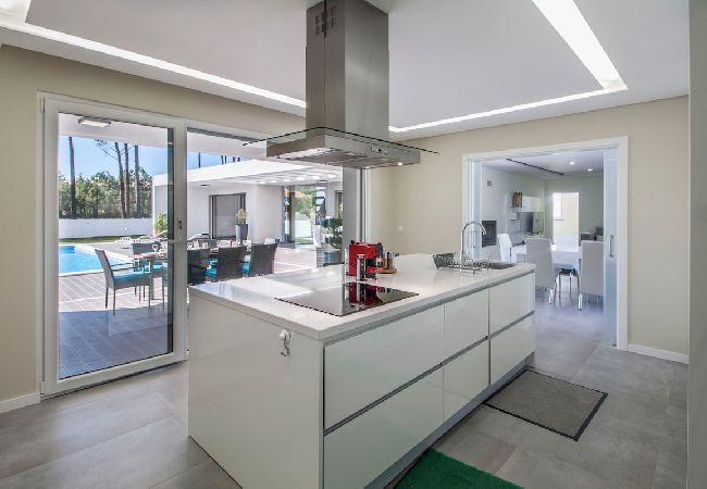A cozinha totalmente equipada e com uma ilha e bancos altos permite a fácil confecção das frescas refeições de verão.
