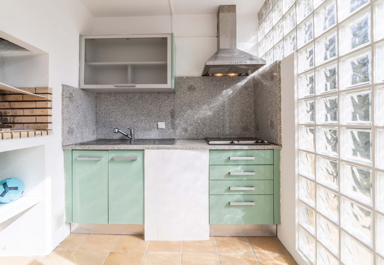 Abrigado e com uma churrasqueira feita em tijolos, convida a refeições demoradas nas noites quentes de verão.