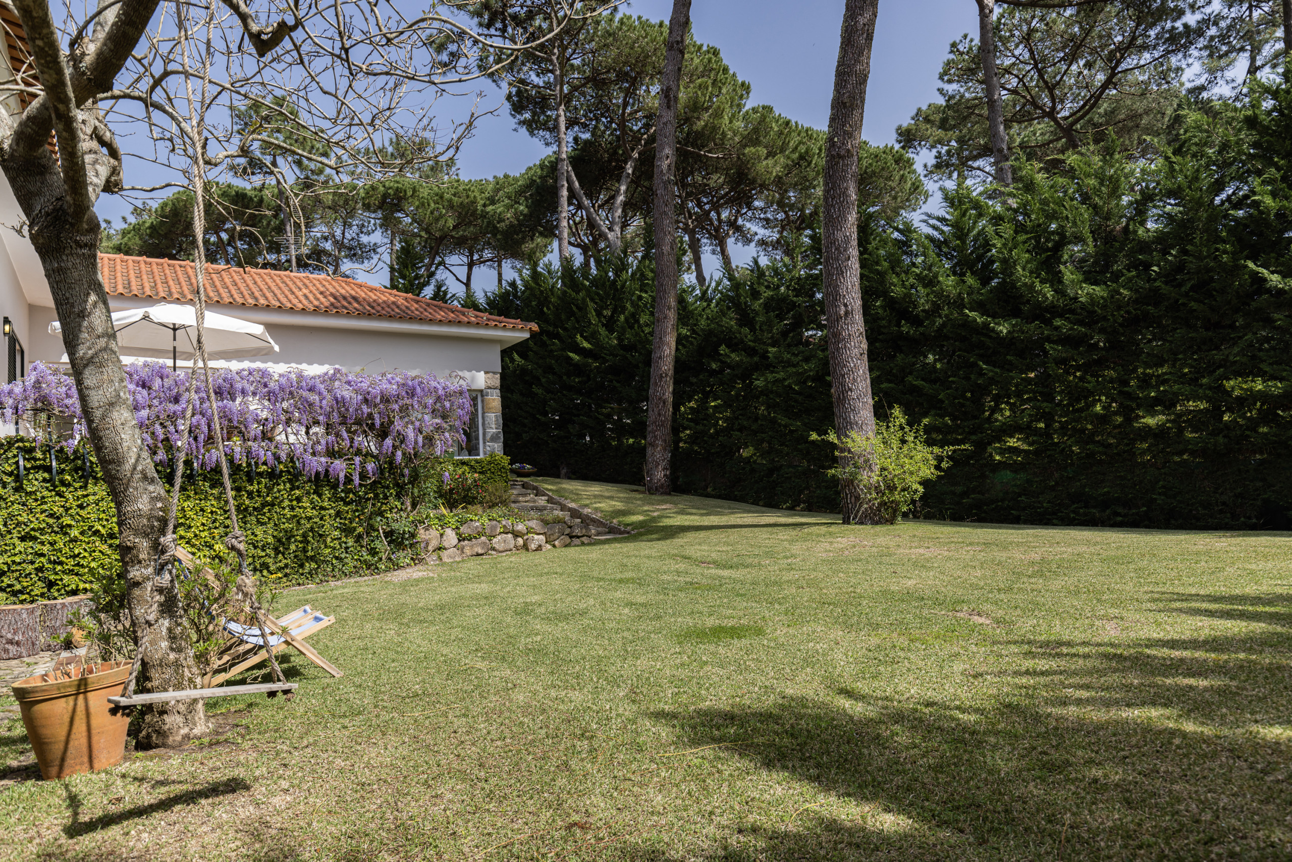 Os destaques da propriedade são o amplo jardim privado e a piscina, totalmente vedada para garantir a tranquilidade das famílias com crianças pequenas. Passe as suas tardes a aproveitar o sol ou a desfrutar de refeições ao ar livre no meio da natureza. Além dos portões, estará numa localização perfeita para explorar uma cena gastronómica de classe mundial. Delicie-se com marisco fresco do Atlântico e com a cozinha tradicional portuguesa, ou embarque num tour de vinhos locais para degustar os famosos vinhos de Colares. Uma série de praias deslumbrantes de areia dourada também fica a uma curta distância de carro.