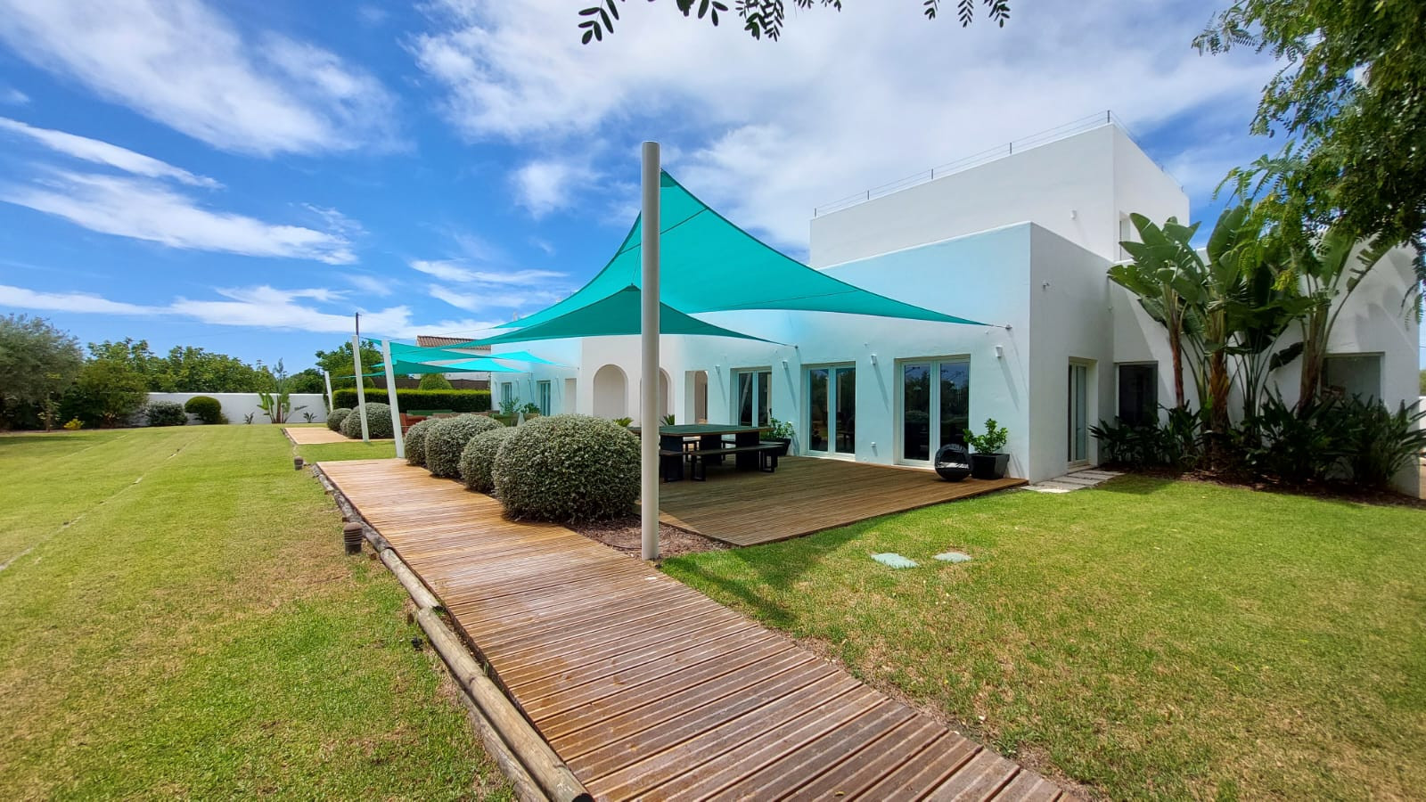 No exterior, encontrará uma relaxante zona de piscina com casa de apoio, TV, cozinha exterior com forno de pizza e barbecue, um ginásio climatizado e 2 campos de padel panorâmicos em vidro. Vários terraços no rés-do-chão, primeiro andar e penthouse oferecem diversas opções para relaxar e jantar.