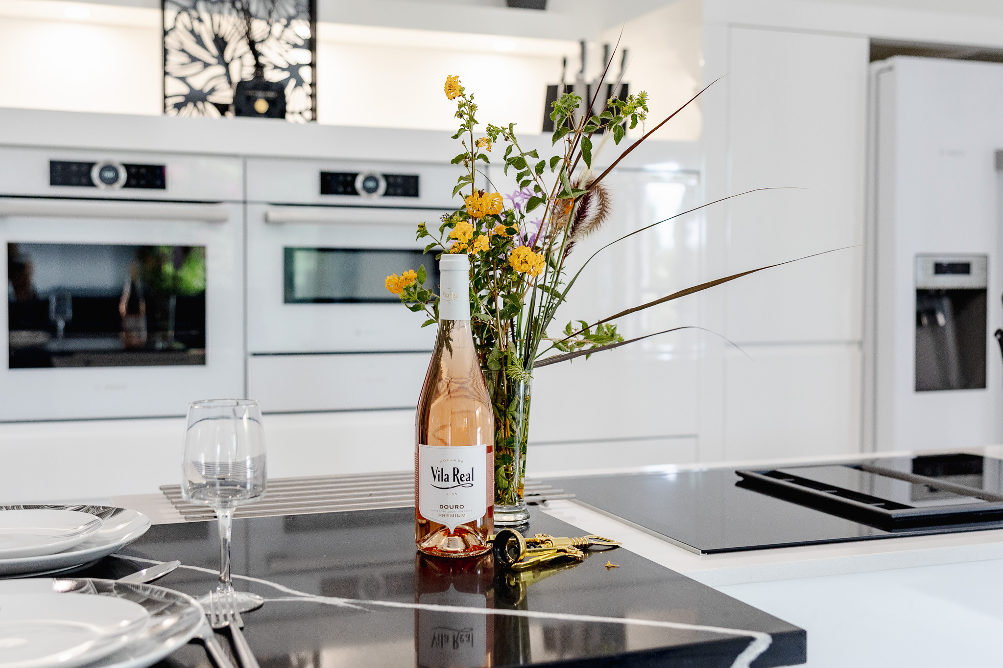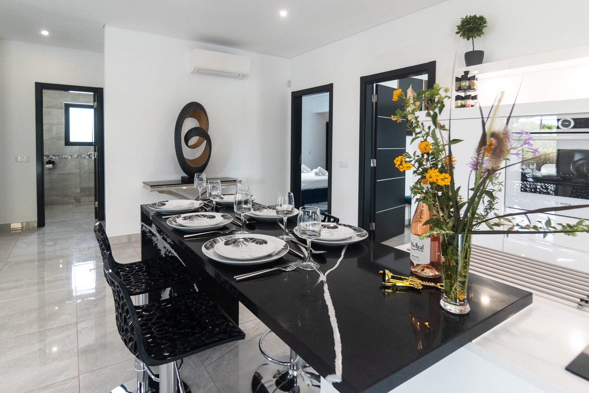 A kitchenette, de inducção, está equipada com frigorífico, microondas, forno, congelador, máquina de lavar louça, louça/talheres, utensílios/cozinha, máquina de café, fritadeira, torradeira e jarro eléctrico.