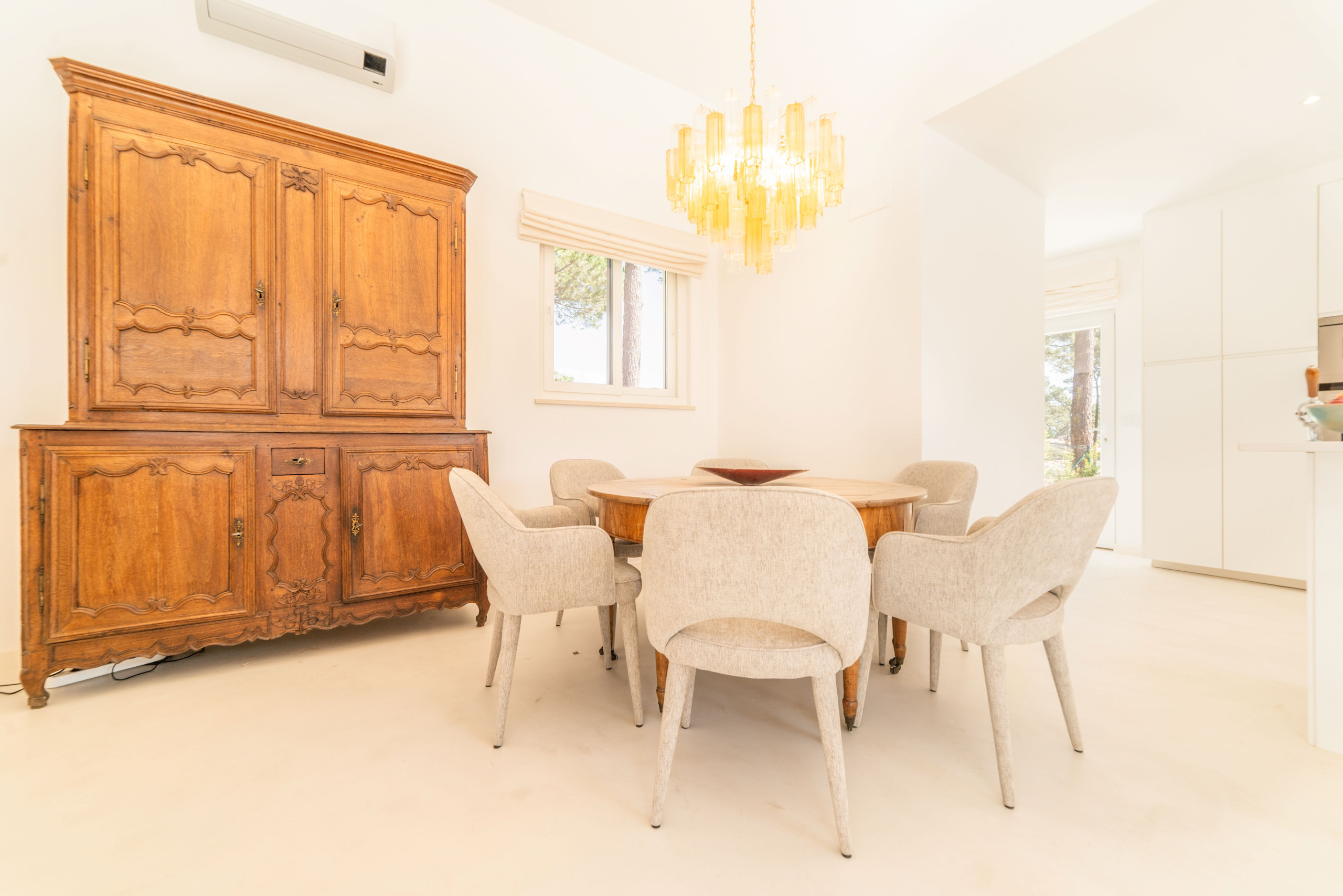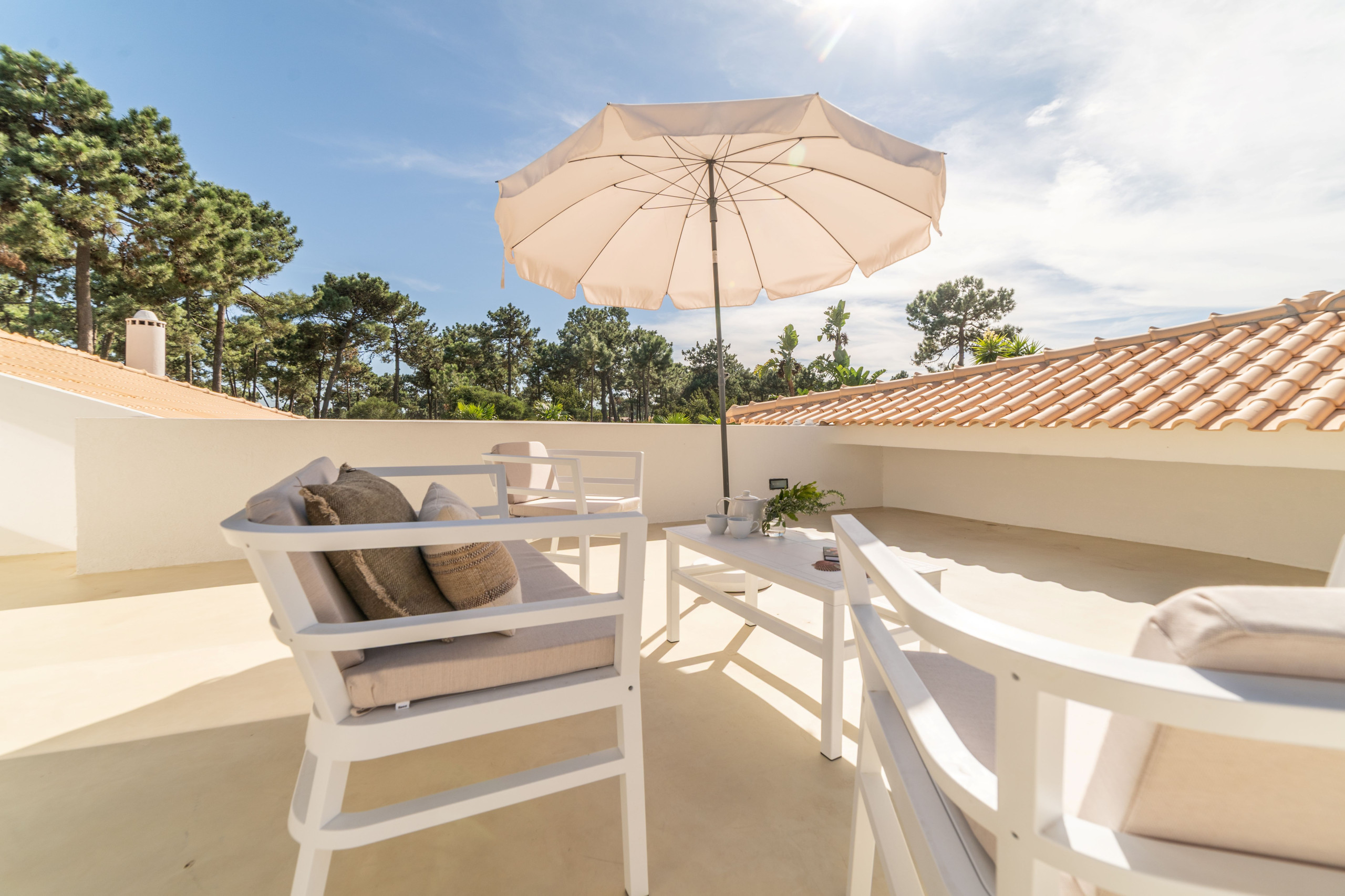 The kitchen leads to the outdoor dining area, a very pleasant and cool space with a barbecue, ideal for warm summer evenings. To make the most out of the favorable Portuguese climate, next to the light blue tiled pool, there is a comfy corner under a pergola, for those who like shade, right beside a row of sun loungers, ready for those who prefer to sunbathe.